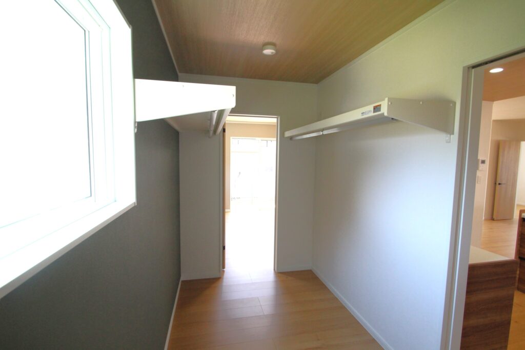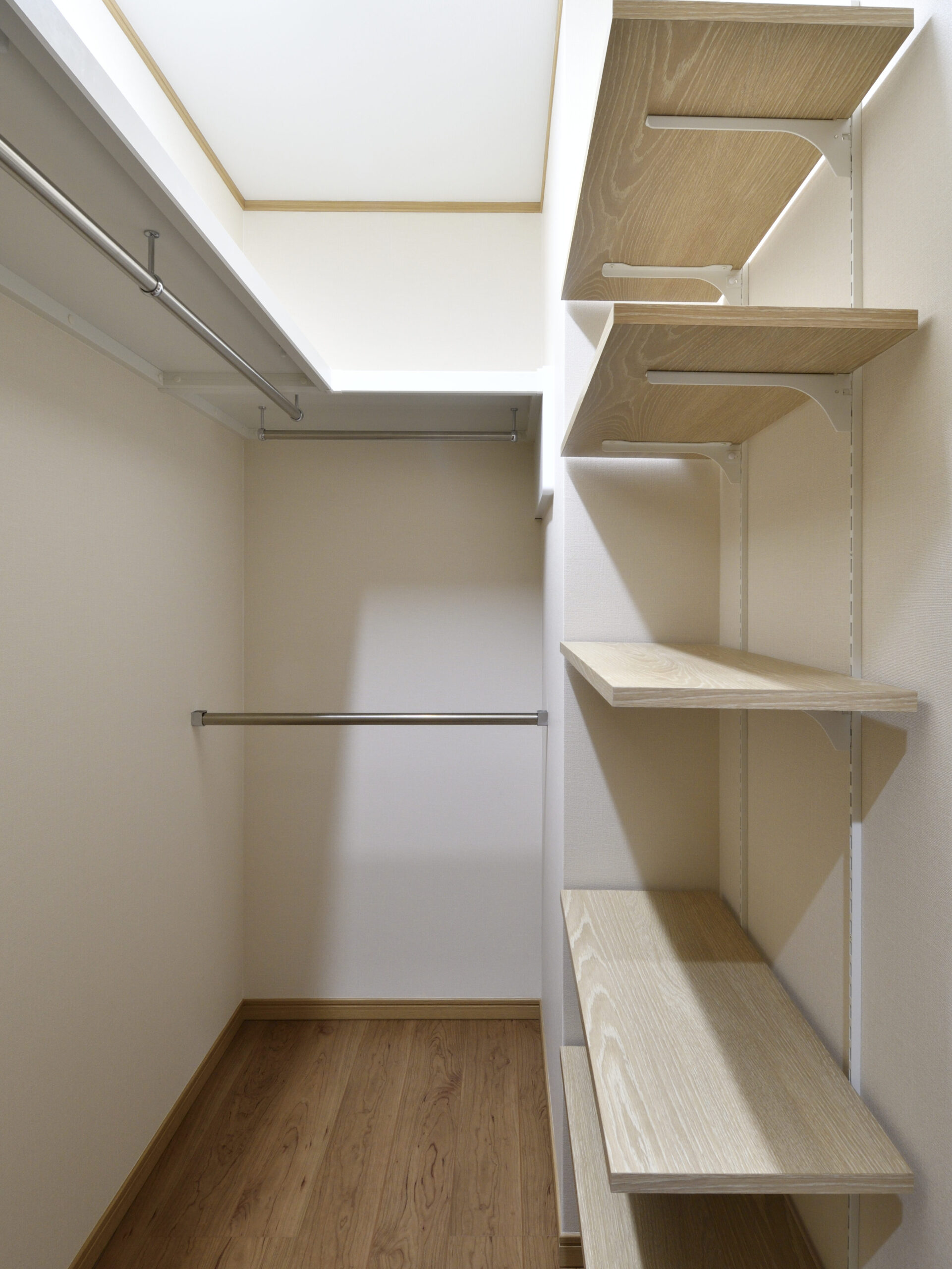 SCL内のハンガーパイプは上着やレインコートを掛けておくのに便利です。やみくもに棚板を増やすのではなくあらかじめどんなものを収納するのかイメージすることが重要です。