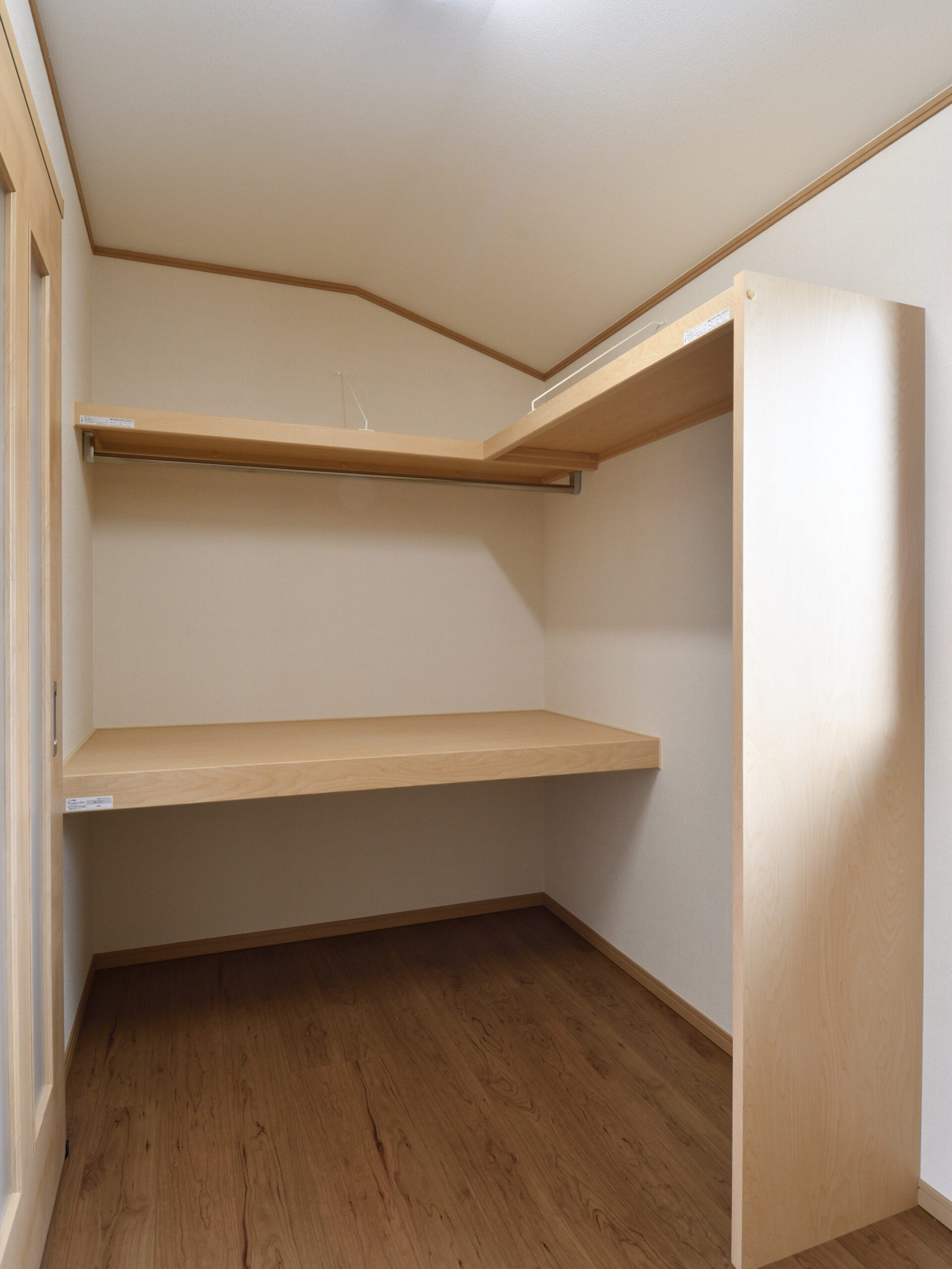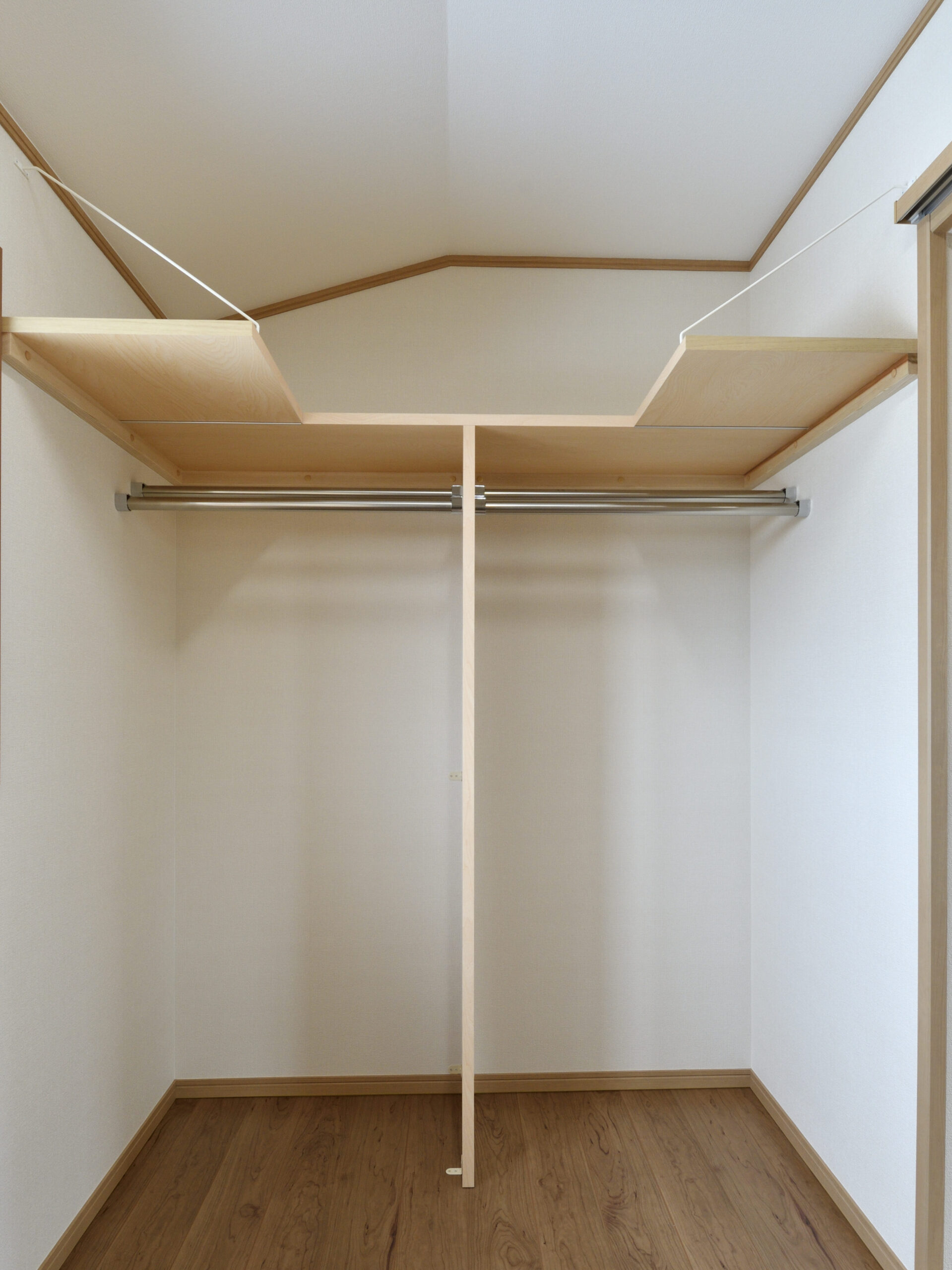 奥行1間(1820mm)のWICの中に、向かい合わせにでハンガーパイプ+枕棚を作っています。お洋服を掛けても十分通路幅が確保できる広さです。
