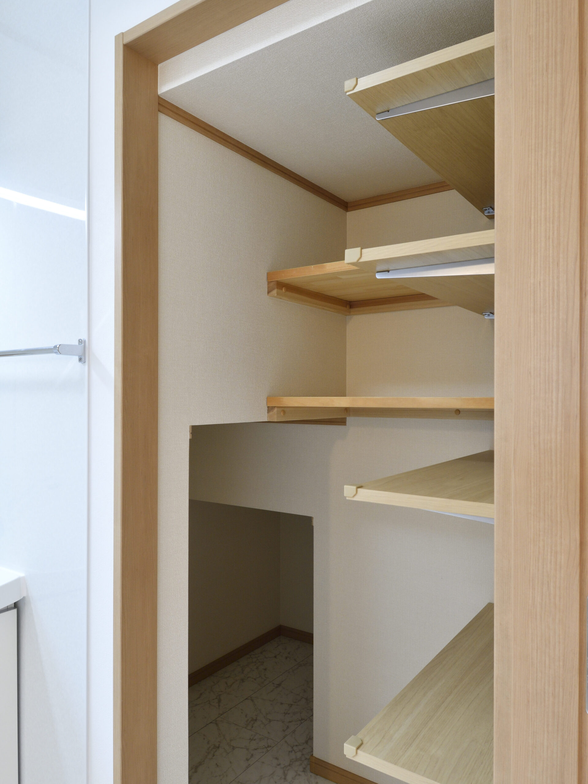L字型に棚板を作ることで、奥行きも十分に生かすことができます。よく使うものはL字の手前部分に置くのがポイントです。ベビーカーなど背の高いものは手前側にしまえます。